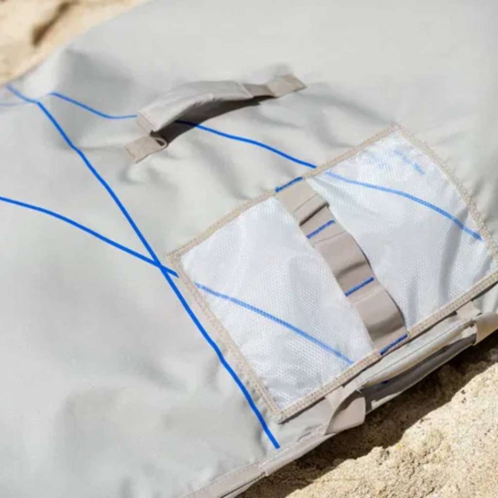 La housse propose un rembourrage mousse de 5 mm, une coque en matériau 100 % recyclé, une fente dédiée pour le foil, une poche intérieure pour accessoires, une sous-face réfléchissante et une poignée centrale pour le transport.
